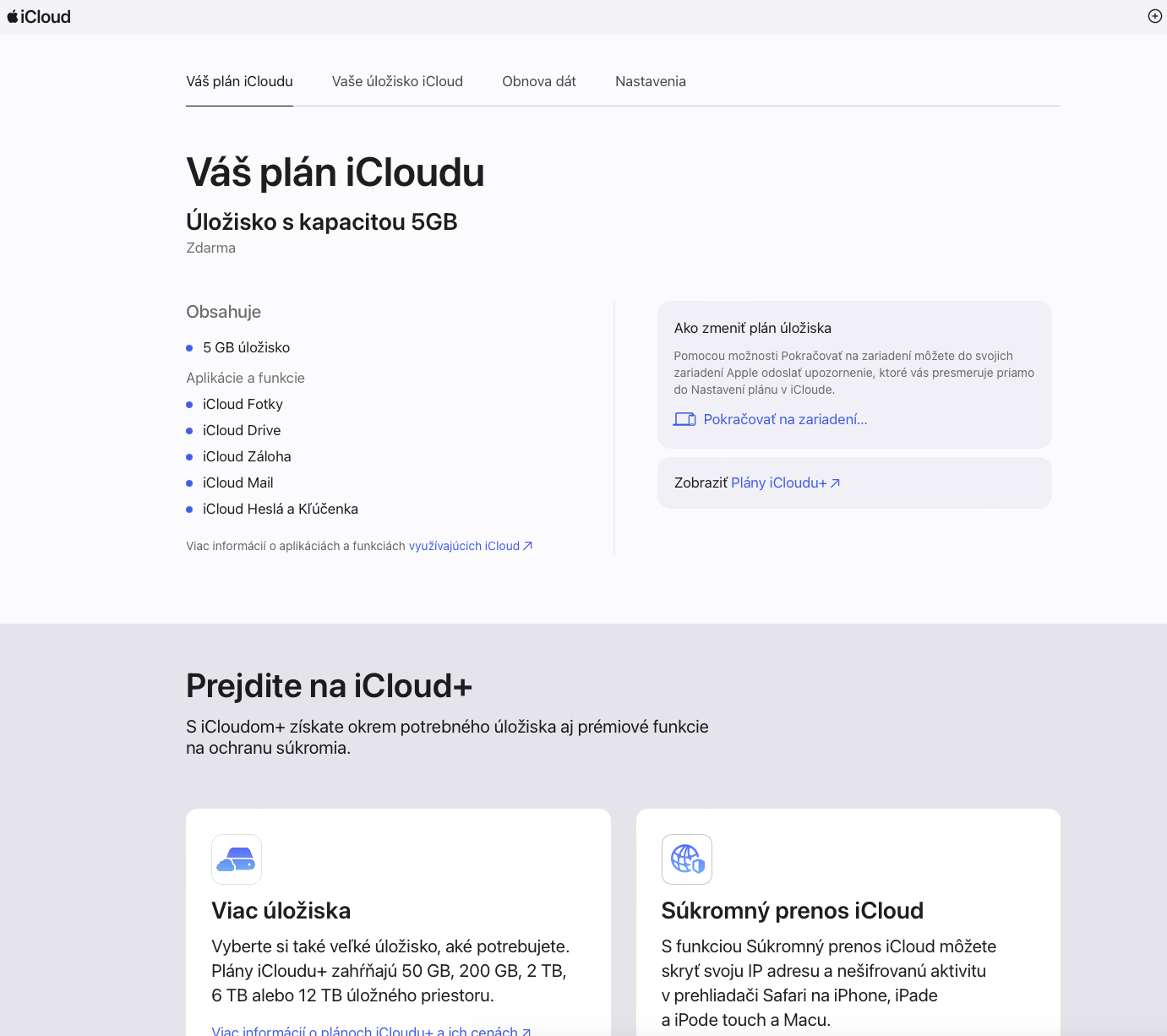 iCloud je vždy iCloud.com,bez ohladu ako je nastavené regionálne rozhranie systému,akurát text správ je vždy preložený do reči nastavenej v regionálnom nastavení systému,kedže iCloud je poskytovaný zdarma,nemá žiadne predplatitelské ID.....u icloud nedôjde k prekročeniu,to si apple dobre stráži a keď sa blíži k limitu,tak Apple pošle upozornenie o tom,že prihláste sa svojim apple ID k icloudu a uvolnite miesto vymazaním nepotrebných súborov a pozastaví nahrávanie ďalšieho obsahu.......až po prihlásení sa do icloudu cez platné apple ID sa objaví možnosť prejsť na platené iCloud+ a platí sa obvykle tak,že sa najprv deponujú prostriedky cez apple iD do apple store nastavenia užívatela a odtial sa platí predplatné,upozorňujúce maily na predplatné a na iné udalosti chodia vždy ako noreply@email.apple.com a pre Europu to vybavuje vždy pobočka Apple Distribution International Ltd. Hollyhill Industrial Estate,Hollyhill Cork Ireland,je to vždy takto zretelne označené aj s logom Apple.....K niektorým zariadeniam dostane užívatel Apple One službu s rôznou eval periodou (dá sa aktivovať a zakúpiť dodatočne aj k zariadeniam,kde to nieje dodávané ),tam je iCloud+ obsiahnutý štandardne,pokial to užívatel ukončí,alebo sa rozhodne ďalej pokračovať bez predplatného,iCloud+ sa ukončí a prepne na bezplatný iCloud...