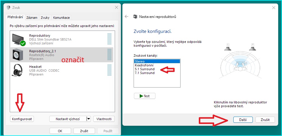 Doufám že to popíšu dobře. Je potřeba v Realtek nastavit výstupy na 5.1. Obrázky možná víc řeknou