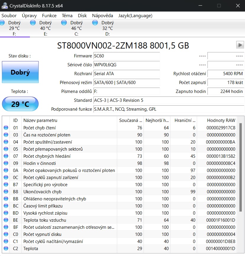na co se zaměřit: chceš zobrazit stav disku, ale velikost okna programu necháš ve výchozím stavu, takže nevidíš případné kritické hodnoty c5,c6, případně c7 pod tím výpisem.