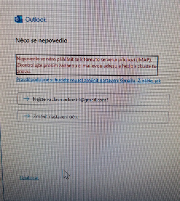 Chvilku točí kolečko a píše, že se hledají účty, do volné kolonky se sám vyplní můj gmail účet, dám další a zobrazí se mi chybová hláška viz příloha. Jasně, že jsme změnil heslo, jenže Outlook mě ho nenechá v tomhle průvodci změnit, nechá mě změnit jen protokol IMAP nebo pop3 a adresy serverů a porty ale heslo nastavit nemůžu. On se stále pokouší připojit s tím původním heslem.