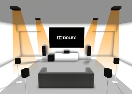 Je to řešeno skutečně individuálními reproduktory které jsou umístěné v prostoru, na stropě, a nebo repro namířené na strop/nahoru k odrazu zvuku