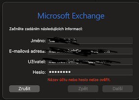 Url na exchange znam, ale Mail appka se me na ni nikdy nezepta. Do MS Outlook jsem na tom samem Macu ucet normalne pridal, ale chci Mail, jsem na nej zvykly. Nevi nekdo, co s tim?