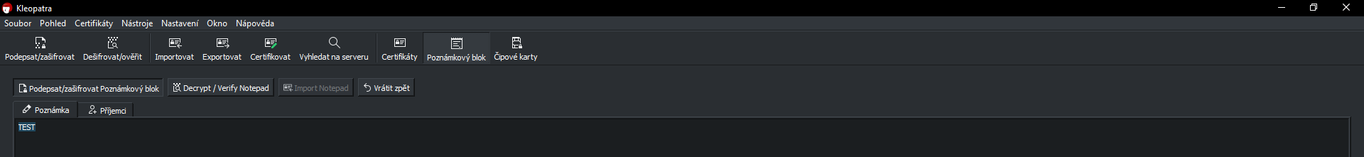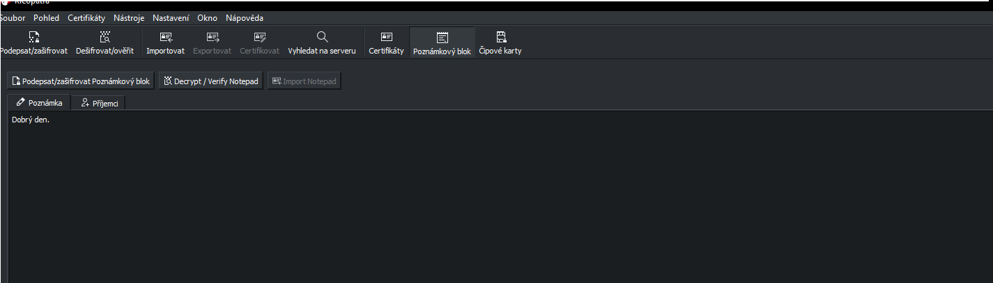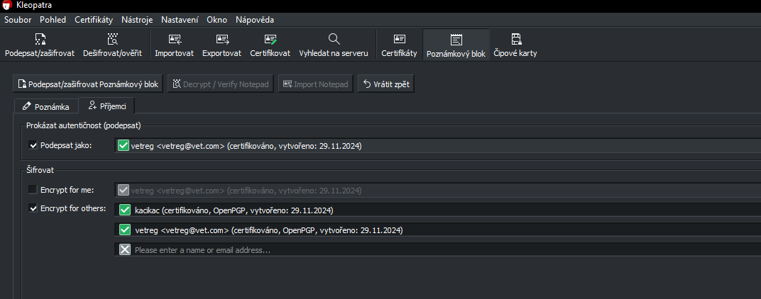 To si příjemce dá do poznámkového bloku a dá dešifrovat a měla by tam být zpráva, kterou jsem napsal. Ale co v kartě poznámkový blok a příjemci? Tam je encrypt for others a mám zadat jméno nebo email.