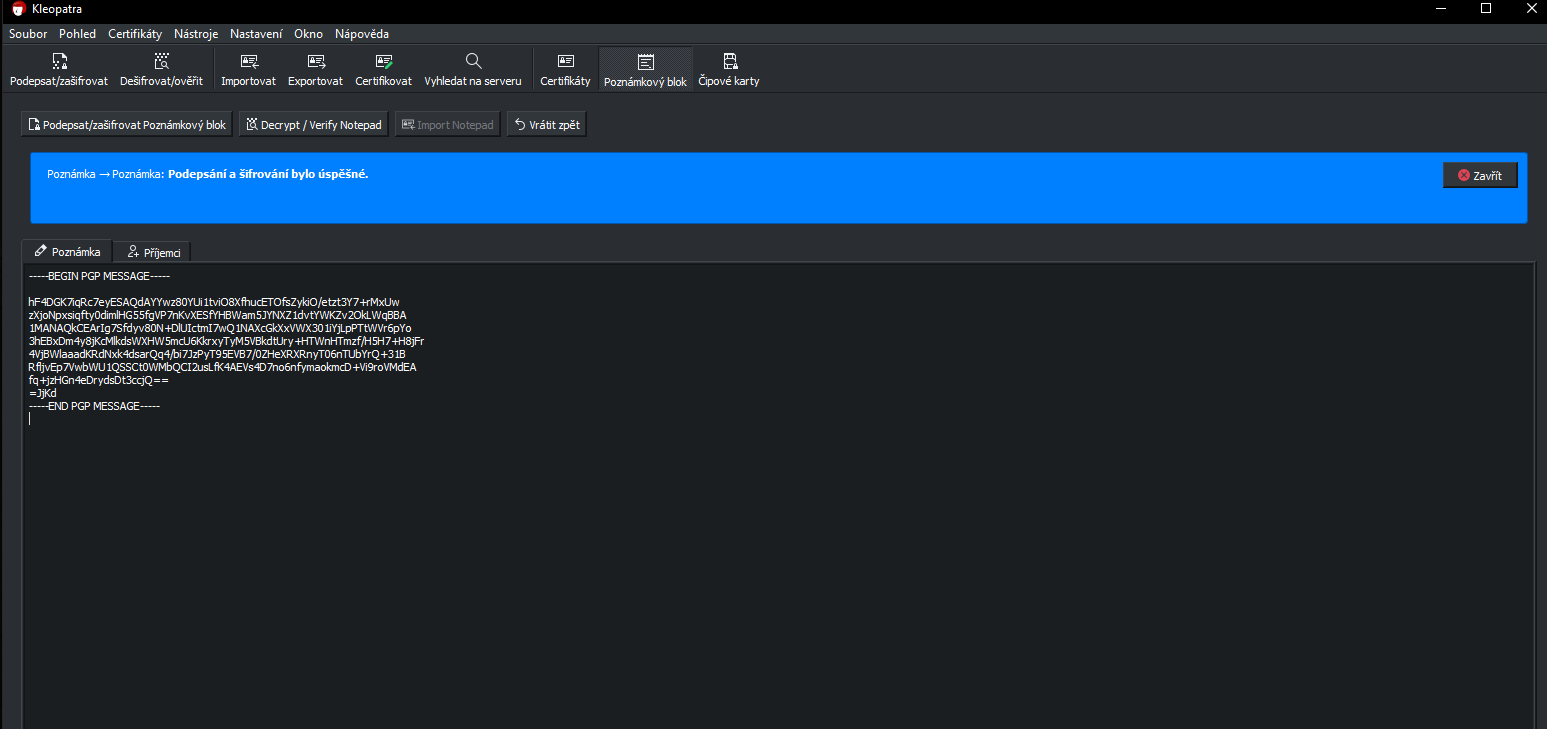 Potřebuji zašifrovat zprávu, kterou odešlu do chatu a příjemce ji bude moc dešifrovat a vidět, to co jsem tam napsal. Hlavně potřebuji jak se to v kleopatře vše dělá. Dám poznámkový blok v kleopatře, napíšu do něj třeba ahoj, dám, co jsem teda zjistil, v kleopatře je karta příjemci. Podepsat jako: to budu asi já..... encrypt for me a encrypt for others. Pro others tam bude příjemce, ale když mám pouze --------BEGIN PGP PUBLIC KEY BLOCK-------- tak co s tím? Když dám zašifrovat, tak mám toto. To je jakoby zašifrovaná zpráva..... ale co s encrypt for others?