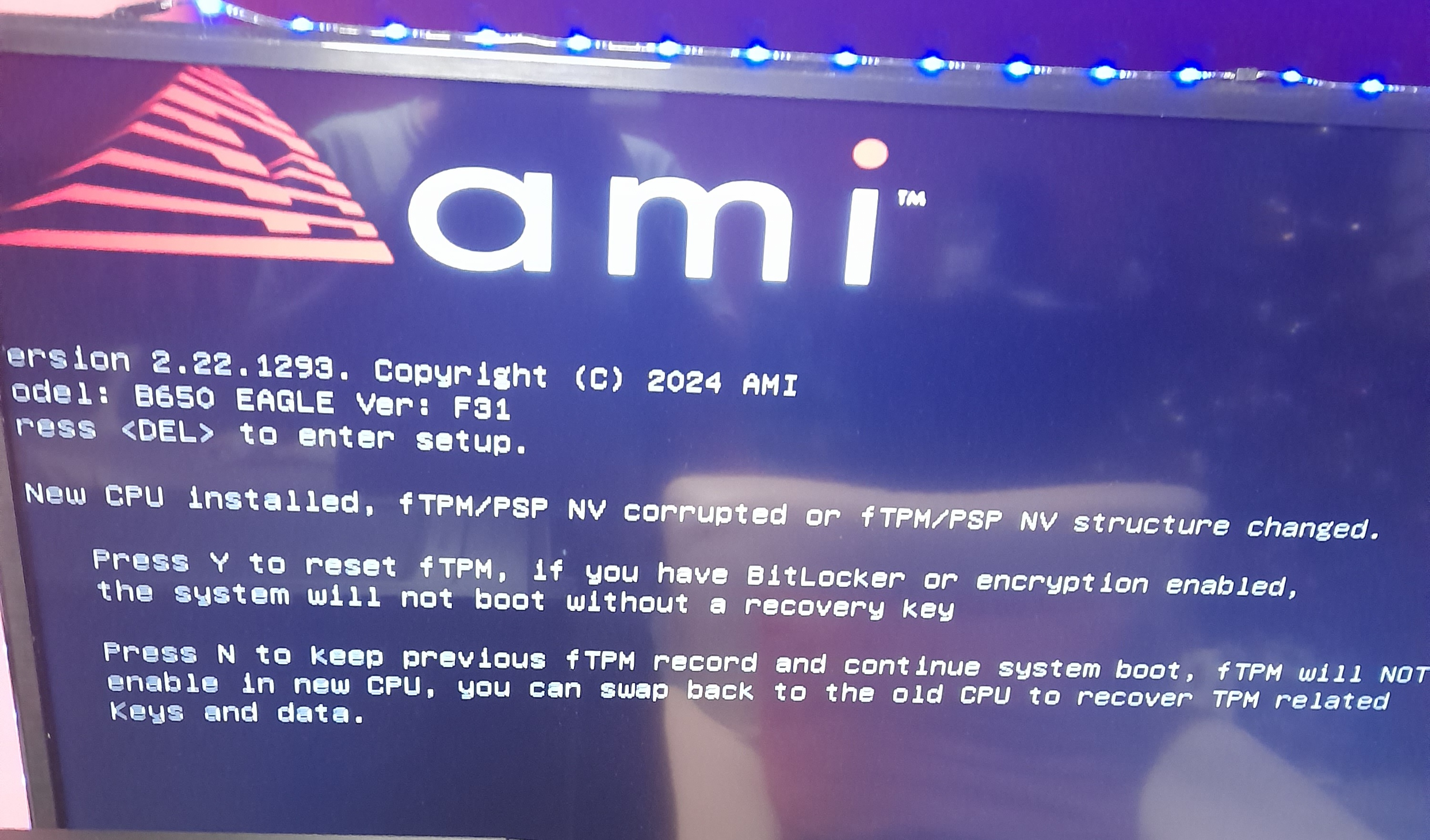 Dobrý den. Nedávno jsem zakoupil nový hardware na stavbu pc. Po sestavení ihned po prvním zapnutí mě ještě před naběhnutím biosu vyskočila hláška : New cpu installed- fTPM/PSP NV corrupted or changed. Následně bios najede v pořádku. fTPM čip je tam nastaven na auto. Ale při pokusu instalace Windows 11 se systém odmítne nainstalovat kvůli kompatibilitě, což je pravděpodobně způsobeno právě tím poškozeným TPM čipem. Nějaké rady prosím. Gygabyte B650 Eagle, cpu AMD Ryzen7 7700x, RAM 32 GB Kit DDR5, SSD Kingston Fury NVMe 1TB.