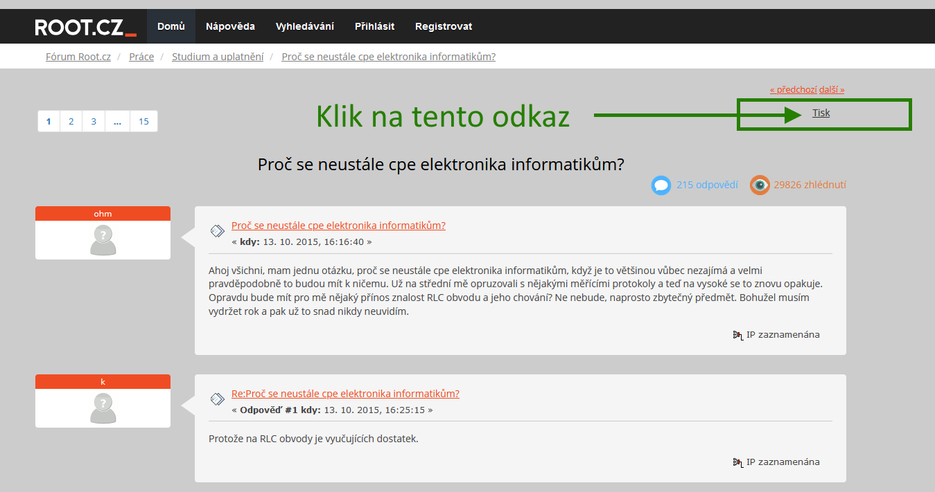 Psal jsem o tom, že na té webové stránce je odkaz s názvem Tisk a když se na něj klikne, tak se zobrazí těch 15 stránek jako jedna bez css formátování.