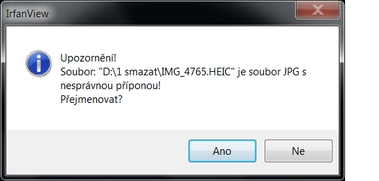 Stáhnul jsem nějaký heic na zkoušku, protože žádný nemám. V Irfanview mi hodí tuhle hlášku na černém pozadí, ale když dám ne, tak ho stejně normálně zobrazí. Pluginy jsem tam kdysi nějaký balík po instalaci přidával, ale už je to dávno.