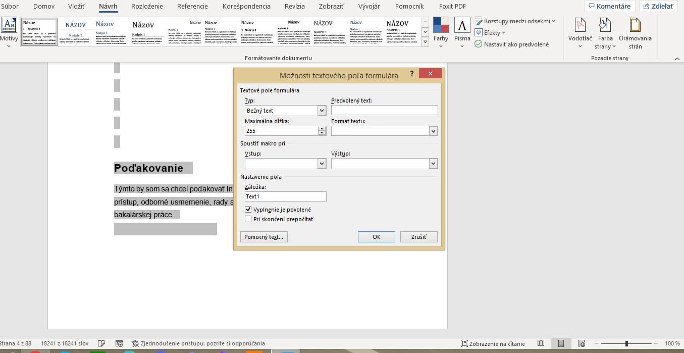 len pri tomto cosi sa tam asi nastavilo lebo ked dvakrat kliknem hodi tabulku možnosti textoveho pola formulara, a nejde nic robit ani oznacit ani kopirovat ked kliknem na sedo ukaze, to robi v celom dokumente na setkych stranach a setko do seda