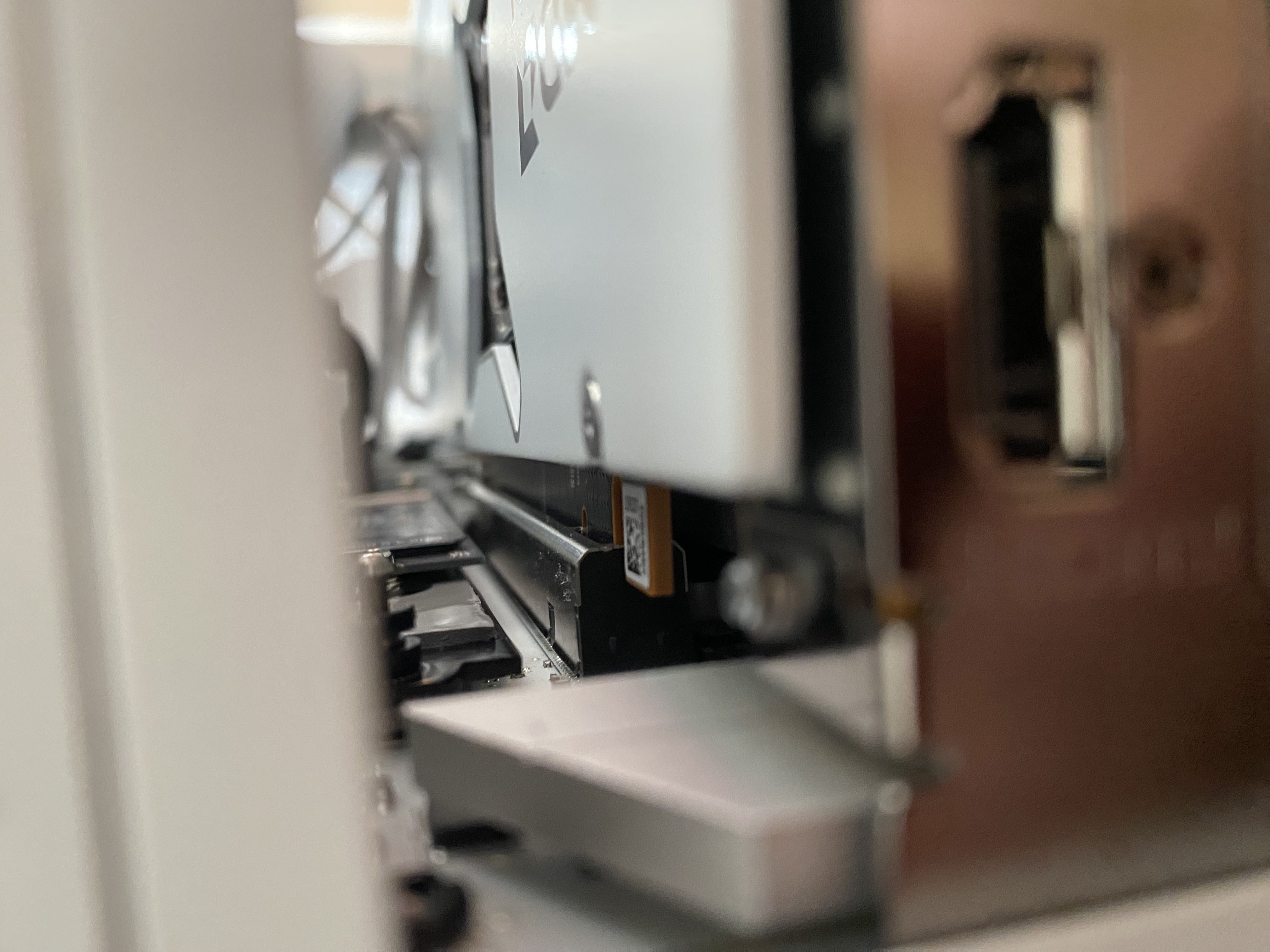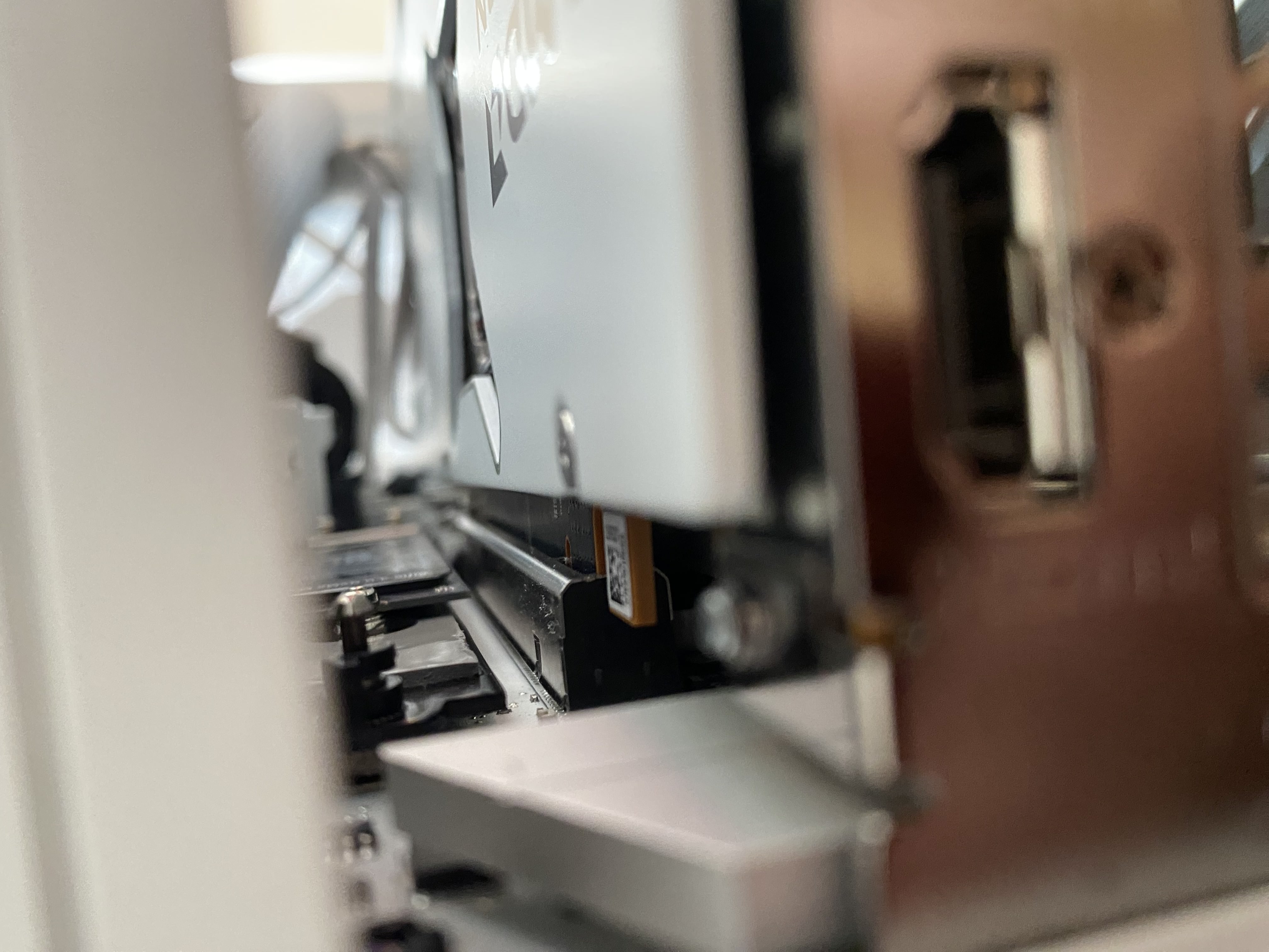 Case mám tenhle, NZXT H7 Flow RGB (2024) All White, napadlo mě to, jestli nezkusit grafiku ještě nějak teoreticky na sílu dotlačit, ale mám strach, abych tam nějak např neponičil ten PCI slot nebo piny na grafice. Snad tyhle fotky něčemu pomůžou, případně můžu odpojit PC a vyfotit ho jinak.