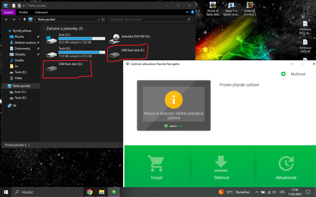 Dobry den, mám problém, aktualizoval jsem mapy ve zmíněné GPS ovšem v 85% mě GPS napsala "vadny kabel (anglicky překlad) " vypla se a zapla, celou dobu mě Aplikace GPS viděla i po odpojení a připojení, aktualizoval jsem vše tedy znovu (s jiným kabelem). vše se povedlo. ovšem teď aplikace stoji na logu Navitel. podle webu mám možnost ji smazat a dat do tovarního nastavené ( nahraje si sama svůj puvodni SW bez map) ale tady začina problém ted jsem připojil GPS ( k PC ovšem program od navitelu GPS nevidí (viz obrazek) k tomu není možnost fotmatovat disk podle návodu obnovy, nevěděl by někdo jak se s tím poprat?