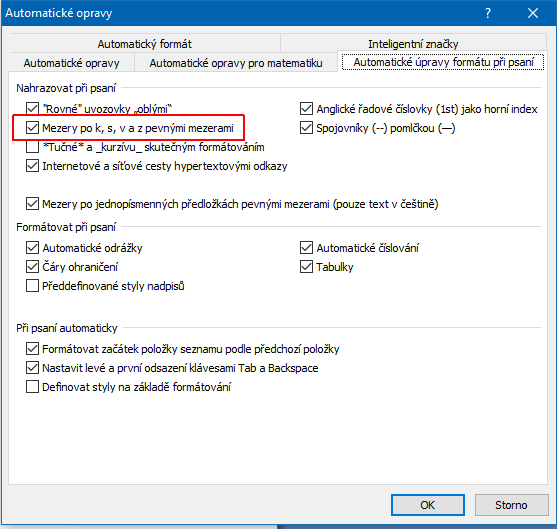 | Při psaní používat tvrdou mezeru (Ctrl+Shift+mezera) a v nastavení zaškrtnout: