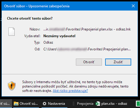 Aj tam som pozeral, zaklikol co sa tyka doveryhodnosti adresara, siete atd . . . ale to je uz ked sa otavara priamo xls, toto je hlaska este pred otvorenim, ci ho chcem otvorit, bezpecnosten upozornenie na subory stiahnute z netu . . . ale vo vlastnostiach toho suboru nieje zaskrkavatko pre subory stiahnute z netu doverovat, a navyse ked ten link je kdekolvek inde (iny adresar, plocha, ....) tak otvara bez toho dopytoveho okna . . .