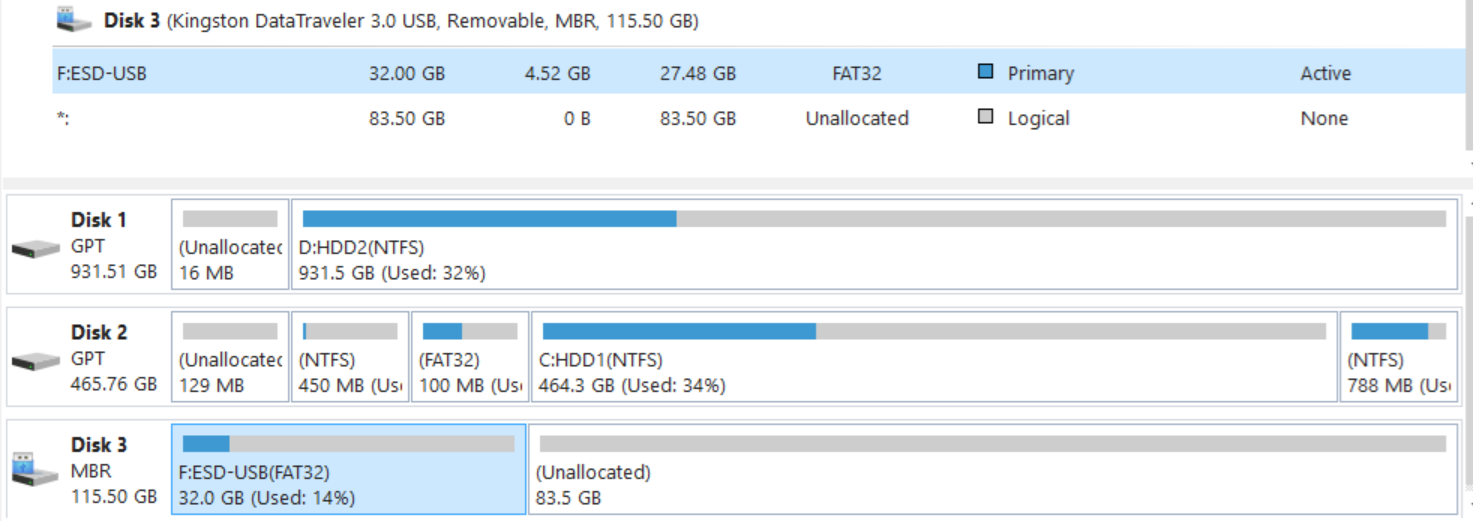 Dík za info, na tom obr. z oddílů v instalátoru mne zmátl ten oddíl 1 disku 2 o velikosti 16 MB MSR (vyhrazené). Měly by tam být vidět jen 2 disky, ten, na který se instaluje a inst. fleška - to je ten disk 1. Ten MSR by měl mít 32 MB. Cituji: Vyhrazený oddíl společnosti Microsoft: Oddíl MSR je vytvořen pouze za následujících podmínek: Je-li jednotka formátována ve formátu GPT. Pokud je systém BIOS nastaven na rozhraní UEFI. Disky menší než 16 GB mají 32MB MSR, zatímco disky větší než 16 GB mají 128MB MSR.
