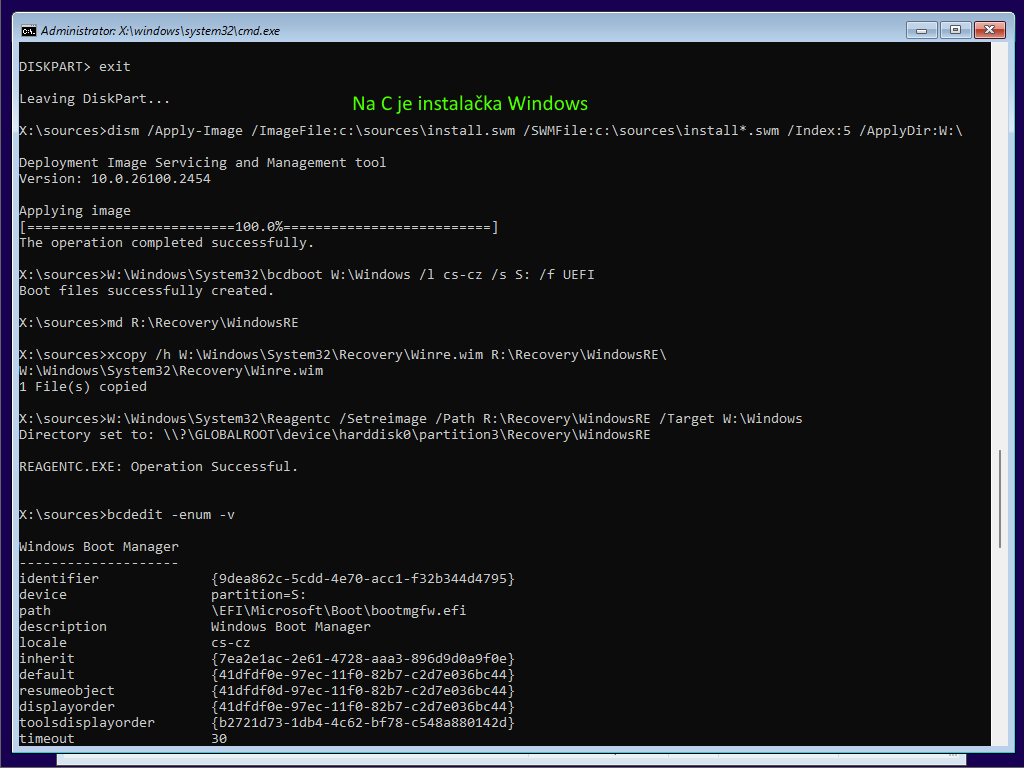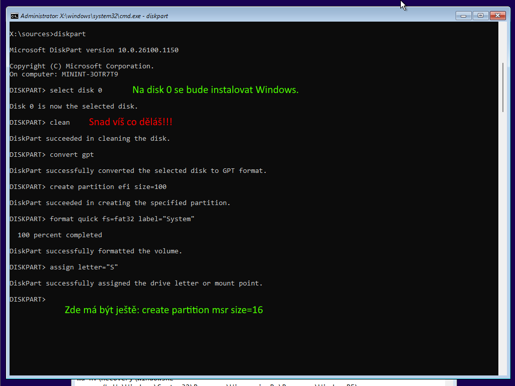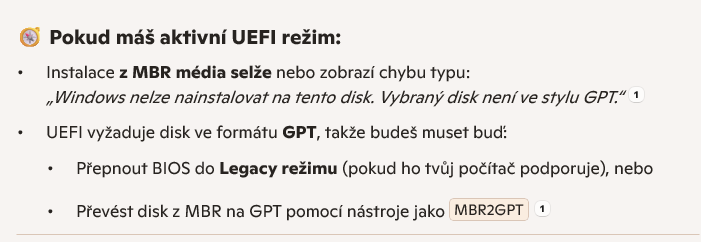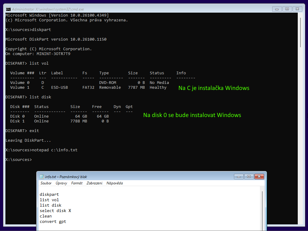 Kroky ktere jsem podniknul: • V BIOS: BOOT → UEFI, Secure Boot → Disabled/OFF • Spusťt to instalacni medium Windows (USB) a hned prvni obrazovce stiskni klavesy [Shift + F10], cim ze ti otevre terminal ktery pouzijeme k prevodu MBR na GPT • V tom terminalu napis tyto prikazi, za kazdym zmackni ENTAR pro potvrzen: