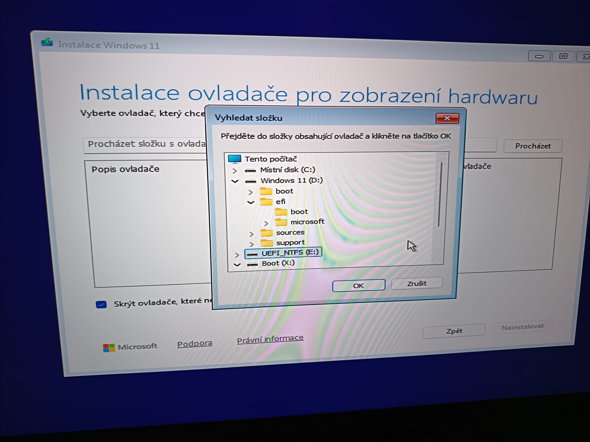 V pripade ze ten NVME neni stale videt, klikni na Ovladace → pridat a zvol ten SAMSUNG_NVME ktery jsme stahli a ulozili na tu instalacku USB.