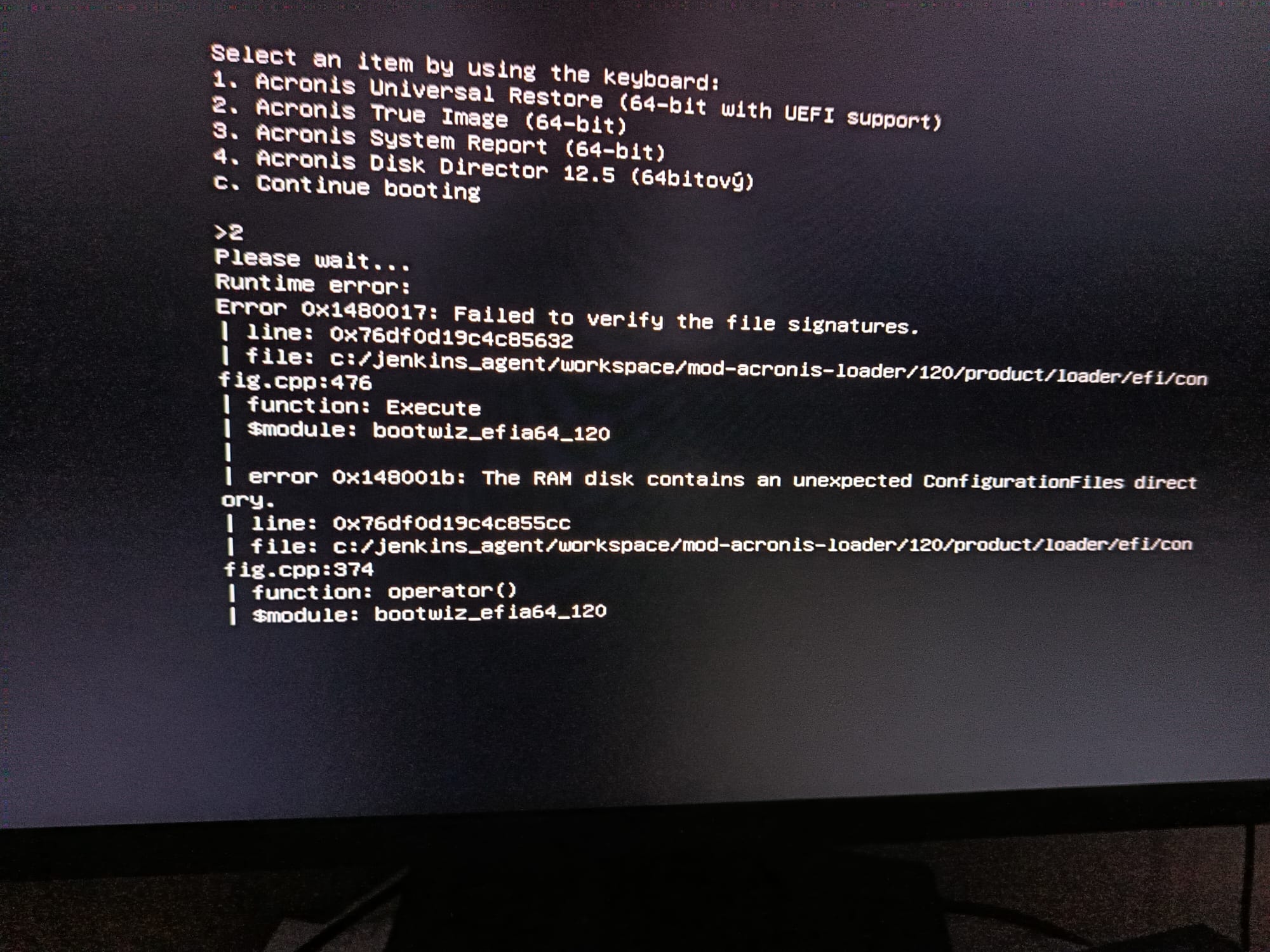 chyba acronis: neříká mi to nic, když selhal csm režim média vybral jsem uefi (co máš zrovna ty). čili zkus pro změnu vybrat v biosu přímý název flashky = csm/legacy mód.