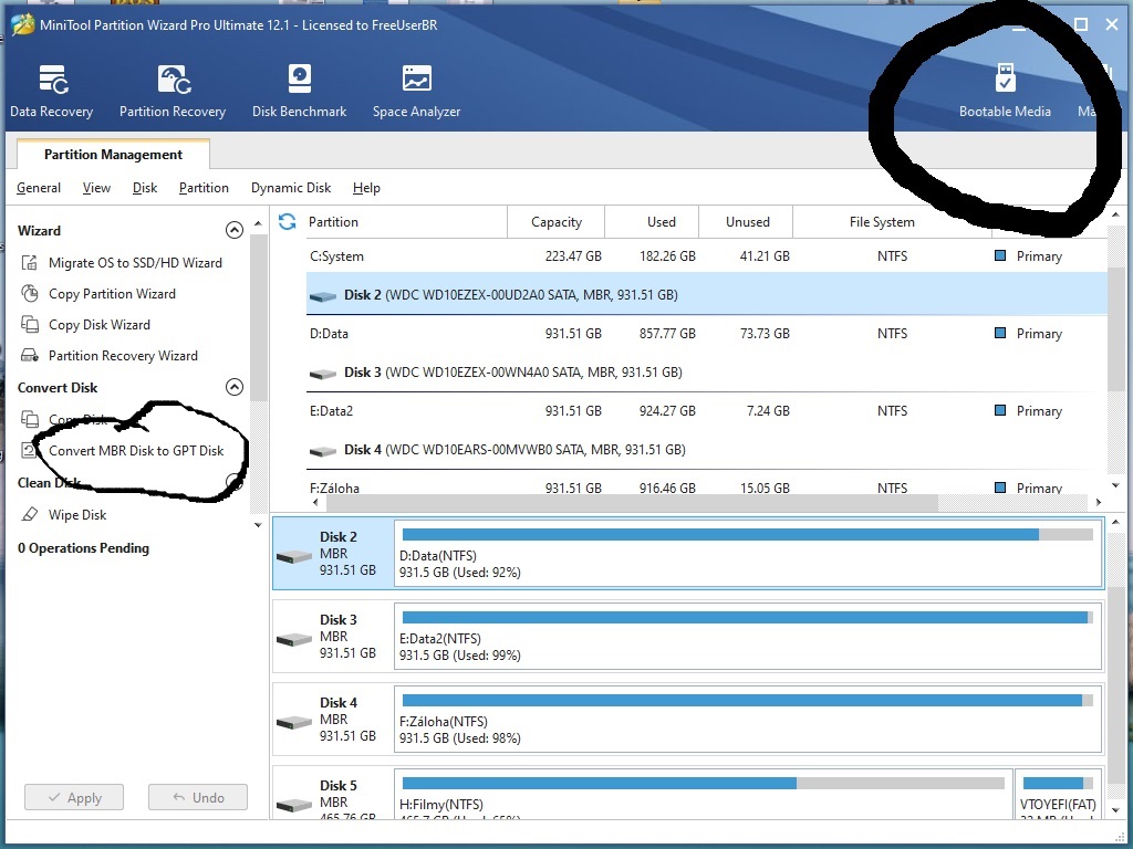 Já používám jen ten partitionwizard. Je zdarma a pro základní potřebu vytvářet oddíly, slučovat, dělit oddíly nebo měnit jejich velikost je naprosto dostačující. Převést jakýkoliv oddíl na jiný umí samozřejmě taky. Ve Tvém případě na GPT. Není problém.