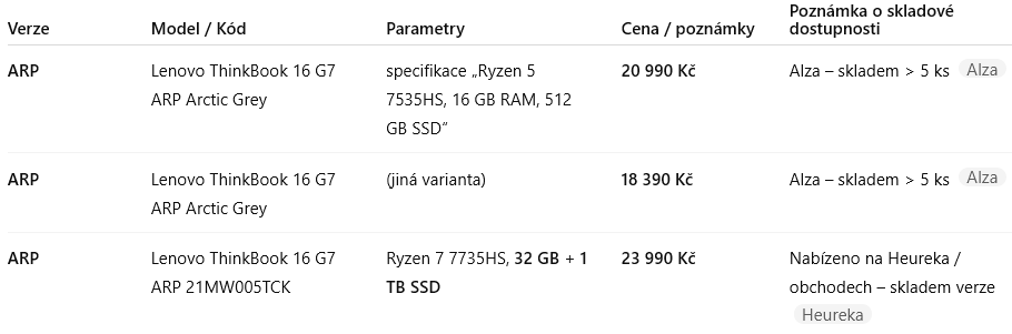 Pro **render a střih videa** jednoznačně **Lenovo ThinkBook 16 G7 ARP** – má silnější CPU, výkonnější grafiku a možnost rozšíření paměti, přitom je levnější.