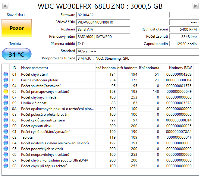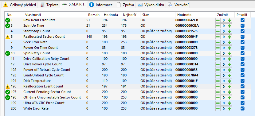 je otázka, jestli jsi ty týdny zpět sledoval konkrétně smart atribut 05 = u tebe rostoucí počet přemapovaných sektorů, anebo jen jakési sentinel oznámení, že stav už není ok.