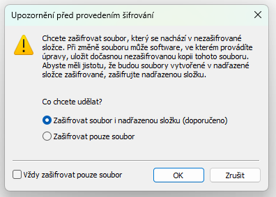 Pokud chceš zašifrovat soubor, zeptá se tě to, jestli zašifrovat soubor a nadřezenou složku (doporučeno) nebo jen soubor.