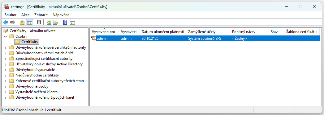 Šifrovací klíče jsou v certmgr.msc pod "Osobní / Certifikáty" a "Důvěryhodné osoby / Certifikáty".