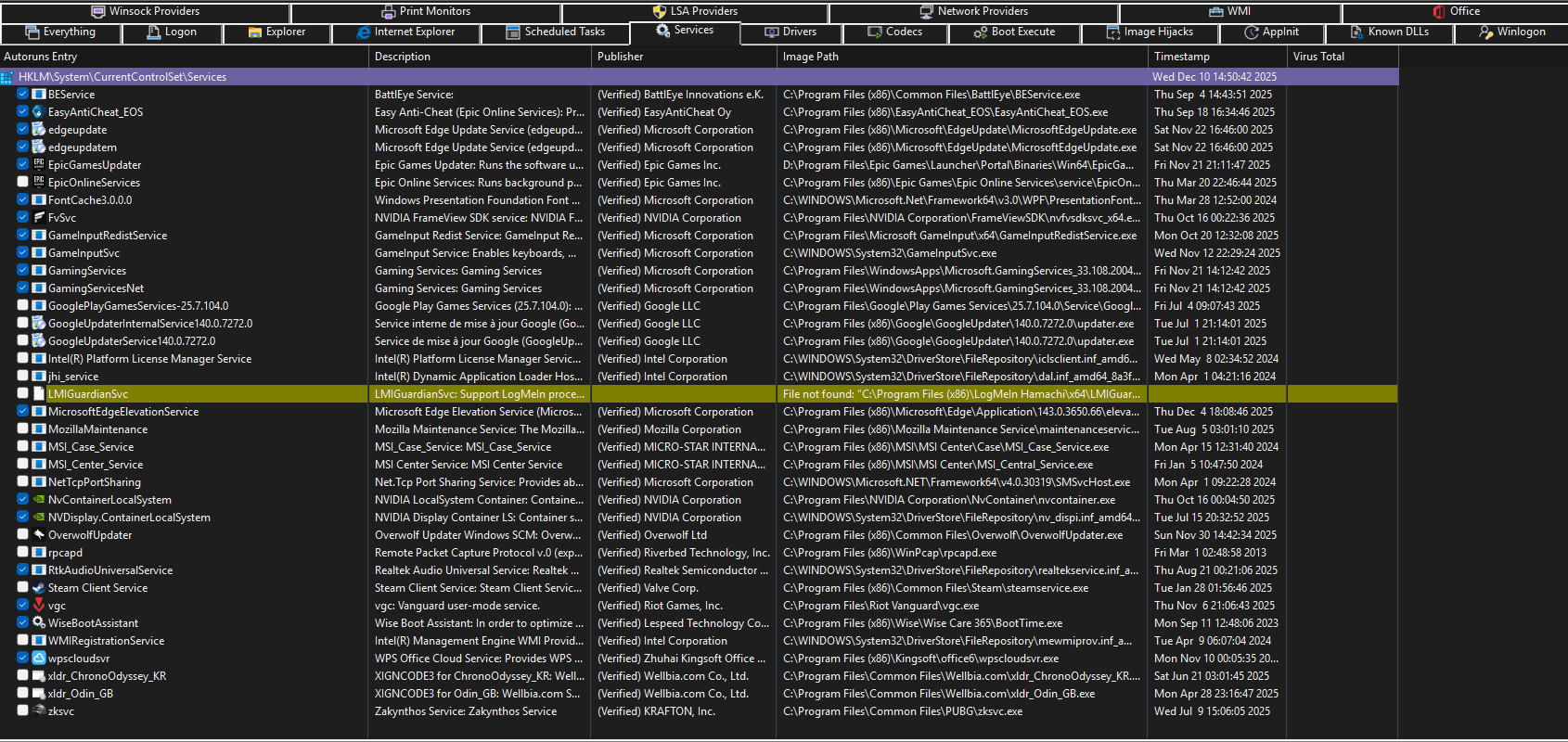 ms autoruns --> logon, tasks, services