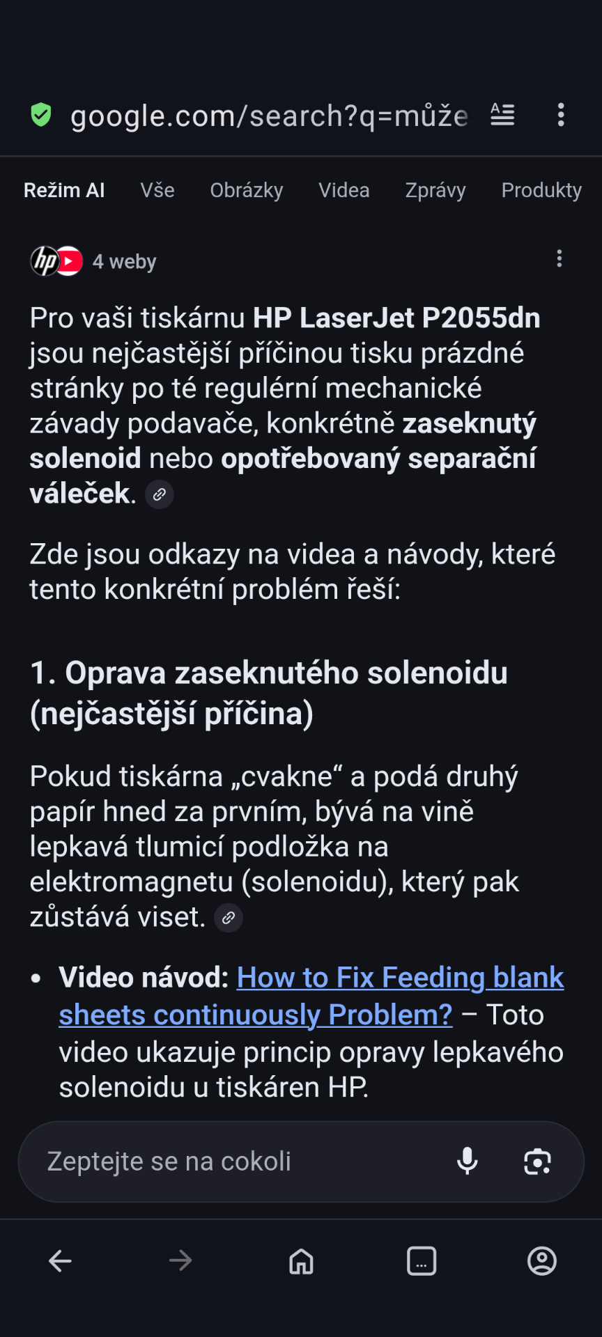 Např. když tiskne dokument který má čtyři strany, tak jsou tištěné strany proložené prázdnými. Totéž u libovolného počtu stran, už od jedné.