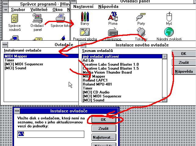 Win 3.11: Správce programů - Ovládací panel - Ovladače - Nejprve vyjmi, poté nainstaluj znova kliknu…