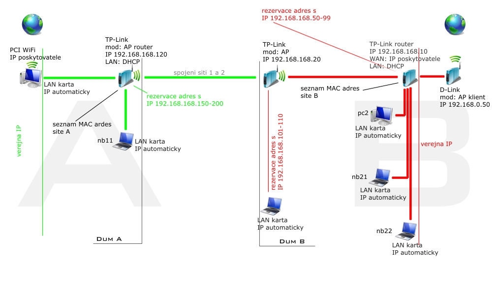 u sítě B je to obdobné, opět musíš povypínat DHCP, pokud jej neumíš správně nastavit. Na obrázku máš špatně nakreslený "AP router" - tam přijde jen AP, jinak počítače na sebe neuvidí.