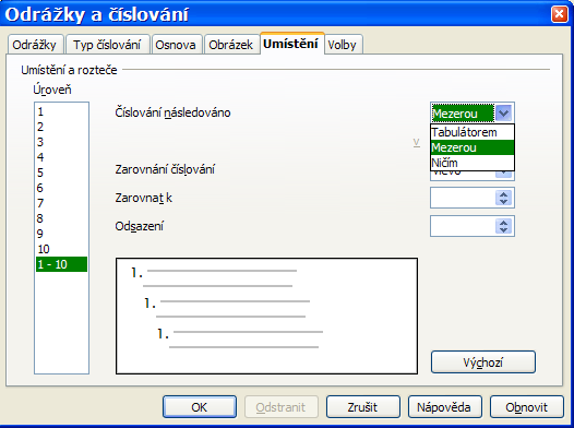 Nejhorší na tom je, že to číslování bez tabulátoru nejde nacpat do výchozího stylu. Musíš si vytvořit vlastní a ten cpát do psaného textu přes F11. Samozřejmě si to pamatuje posloupnost odstavců, takže když začínáš novou řadu, nesmíš zapomenout první odstavec restartovat.