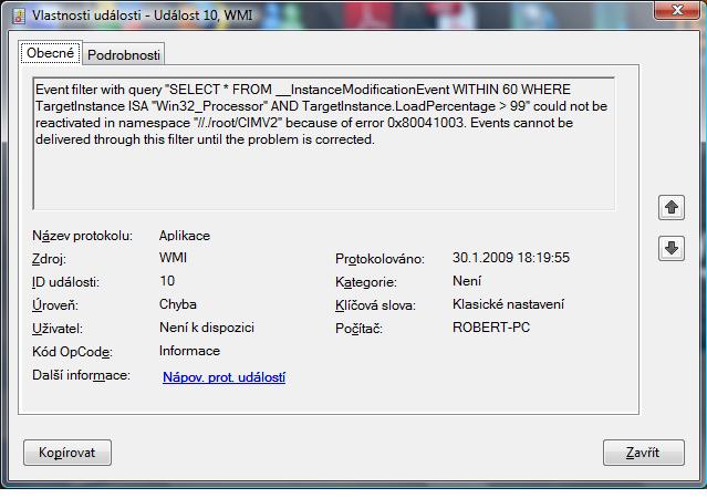 Ahoj všem, našel jsem chybu v systémových informacích aplikací: chyba WMI ID události 10.