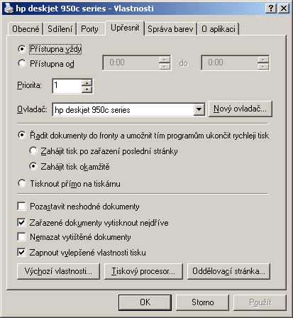 Nastavení mám naprosto stejné jako na uvedeném obrázku. Měnit jsem ho nezkoušel. Ovladač na XP by měl být jiný než na Vistě (na Vistě jsem původně zkoušel ovladač který si tam nainstaloval sám systém, když to nešlo tak sem ze stránek HP stáhnul nový a nainstaloval jsem nový, na XP je ovladač který byl dodán k tiskárně ) navíc Vista má 64bit ovladač a XP 32bit.