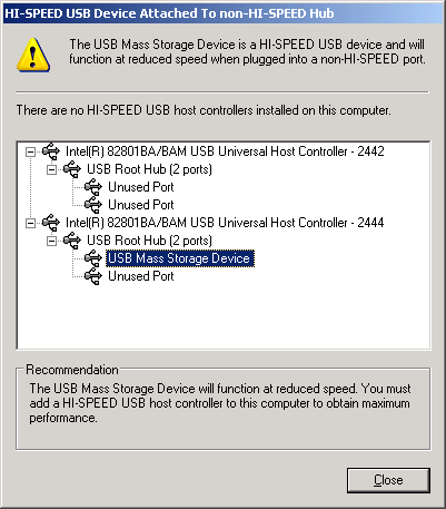 je to hláška windows které díky servicepackům umí usb2.0, ale neznamená to že je umí i hardware onoho pc. windows poznají že koncové zařízení je usb2.0, a celkem zbytečně uživateli doporučují, aby zařízení připojil k řadiči usb2.0 - jenže ve starém krámu takový řadič není - a windows by prostě udělaly líp kdyby si tuto hlášku odpustily.