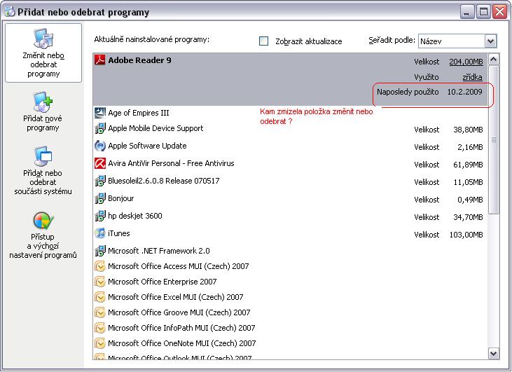 Včera jsem spustil hru no a jak se zdá tak v cracku byl vir. Upozornil mě na to kamarád, který mu na zavirovaný crack upozornil Avira Antivir (Freeware). Já jsem se ničeho nebál, protože jsem soubor projel NOD 32 a nic nenašel takže jsem neměl starosti. Ovšem po vypnutí hry jsem měl hozené rozlišení na 640x480, když jsem chtěl změnit nastavení obrazovky, tak to napsalo že nemůžu, že nejsem správce, a když jsem to chtěl zavřít, tak to taky napsalo že nejsem admin ale poté se to samo zavřelo. To by ještě nebyl takový problém, kdybych neměl rozházeného správce Přidat nebo odebrat programy. Zmizela mi z něj polovina nainstalovaných souborů, a zbylé nejdou odstranit, protože u nich chybí tlačítko odebrat. Navíc se tam přidaly nějaké soubory z MS Office 2007. Podívejte se na přiložený screen a posuďte sami.