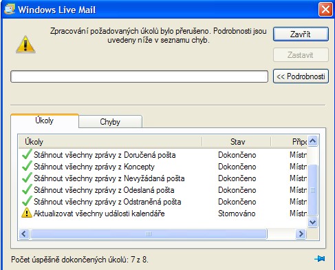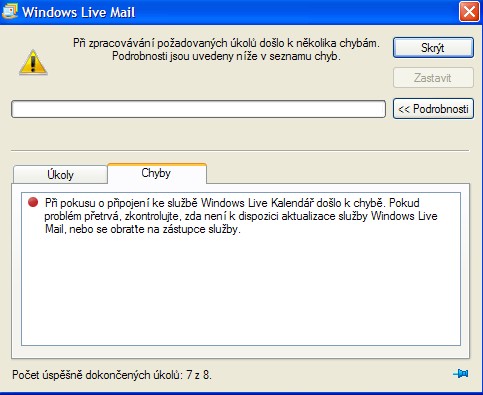 Už jsem to tady jednou psal, ale stále jsem nepřišel na to, jak vyřešit problém se spouštěním Windows Live Mail. Během načítání se postupně stáhnou jednotlivé zprávy z pošty, ale pak se to zasekne při aktualizaci Kalendáře (poslední úkol, který se provádí). To způsobí na určitou dobu zamrznutí PC (CPU jede na 100%), pak to vyhodí hlášku o chybě a po odkliknutí vše funguje normálně. Nepomohla ani přeinstalace programu.