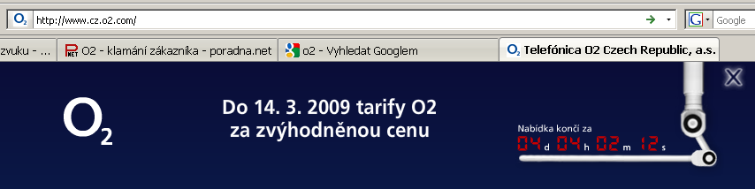 Používám dlouhá léta předplacenou kartu O2 a paušál jsem dlouho odmítal. Jelikož jsem se z www stránek O2 dozvěděl, že do 14.3. je sleva 30% na paušální tarify tak jsem si řekl, že by se to už mohlo vyplatit. Podrobně jsem pročetl nabídku a jelikož jsem nenalezl žádné skryté háčky a bylo vše srozumitelné, zavolal jsem operátorce a objednal jsem tarif. Operátorka potvrdila, že vše platí tak jak je prezentováno na netu. Vše se zdálo skvělé, ale jen cca 5 minut, kdy mě operátorka volala zpět a říkala, že po konzultaci s nadřízeným už tato sleva neplatí. Bližší vysvětlení jsem se nedozvěděl a i když je teprve 10.3 a akce má trvat do 14.3 tak mám prostě smůlu. Samozřejmě, že jsem hned objednávku zrušil. Tímto chci upozornit každého potenciálního zákazníka O2 na jejich nekalé praktiky..... Nevěřte tomu co mají na www stánkách, když dojde na lámání chleba tak to neplatí....