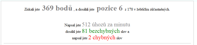Získali jste 129 bodů, a dosáhli jste pozice 477 z 759 v žebříčku zůčastněných.