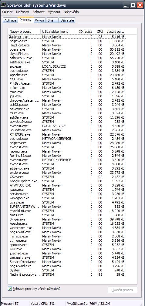 Měl jsem spuštěný SAS, Skype, Apache PHP + SQL server, Avast, QIP Infium a hromadu nepotřebného softu, jenom se bojím, abych nezrušil něco, co nemám.
