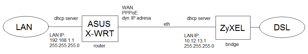 mám internetové DSL pripojenie a zapojené dva routre - Asus wl 500gP s nainštalovaným W-WRT a ZyXEL P-660HW. Pripojenie je prostredníctvom PPPoE s dynamicky prideľovanou IP adresou. ZyXEL je prepnutý do bridge modu a Asus je router. Popis zapojenia aj s nastavením IP adries je v priloženom obrázku.