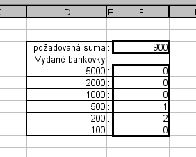 Dobrý den, potřeboval bych poradit s takovým jedním příkladem v excelu. Ten příklad je o bankomatu a třeba zadám 8700 a aby ten program vyjel kolik tam bude jednotlivejch bankovek, tzn. 1 pětitisícovka, 1 dvoutisícovka, 1 tisícovka, 1 pětistovka a jedna dvoustovka. Prostě aby mi napsal co mi má z toho bankomatu vyjet. Když tak to někam hoďte ve wordu, abych si to mohl stáhnout. Díky za pomoc