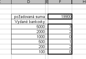 Hodnota sloupce F je vysledek celociselneho deleni. Vstupni hodnoty jsou: zbytek z predchoziho radku (u prvniho je to vstupni hodnota) a hodnota bankovy v tom radku