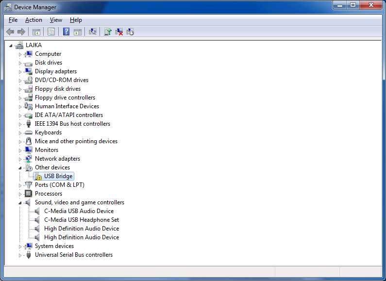 Problém je následující, W7 po připojení telefonu samy najdou zvukové ovladače (C-Media USB Headphone Set), ale problém nastává s USB Bridge, viz. obrázek: