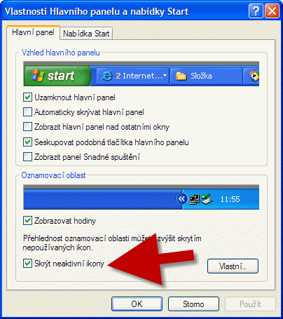 Zdravím,pamětliva Vaší rady v nabídce Start v hlavním panelu jsem nezaškrtla SKRÝT AKTIVNÍ IKONY a nic i když jsou zaškrtlé,pořád stejně,tudíž jsem zkusila VLASTNÍ NASTAVENÍ UPRAVIT OZNAMOVÁNÍ zaškrtla ikonu BEZPEČNĚ atd.ZOBRAZIT VŽDY,nic se neděje.Měla jsem vloni PC v opravě,před ní jsem měla vedle hodin jakoby modrou bublinu se dvěma šipkama vlevo-skryté ikony,po klepnutí se ikony objevily,i ted ve VLASTNÍ NASTAVENÍ JSOU ZAŠKRTNUTY IKONY SKRÝT atd.např.ikona ICQ- NEPŘÍTOMEN,přitom tato ikona i jiné,které mají být skryty,skryty nejsou,asi na to kašlu,děláme co můžeme a nic,hezké odpoledne