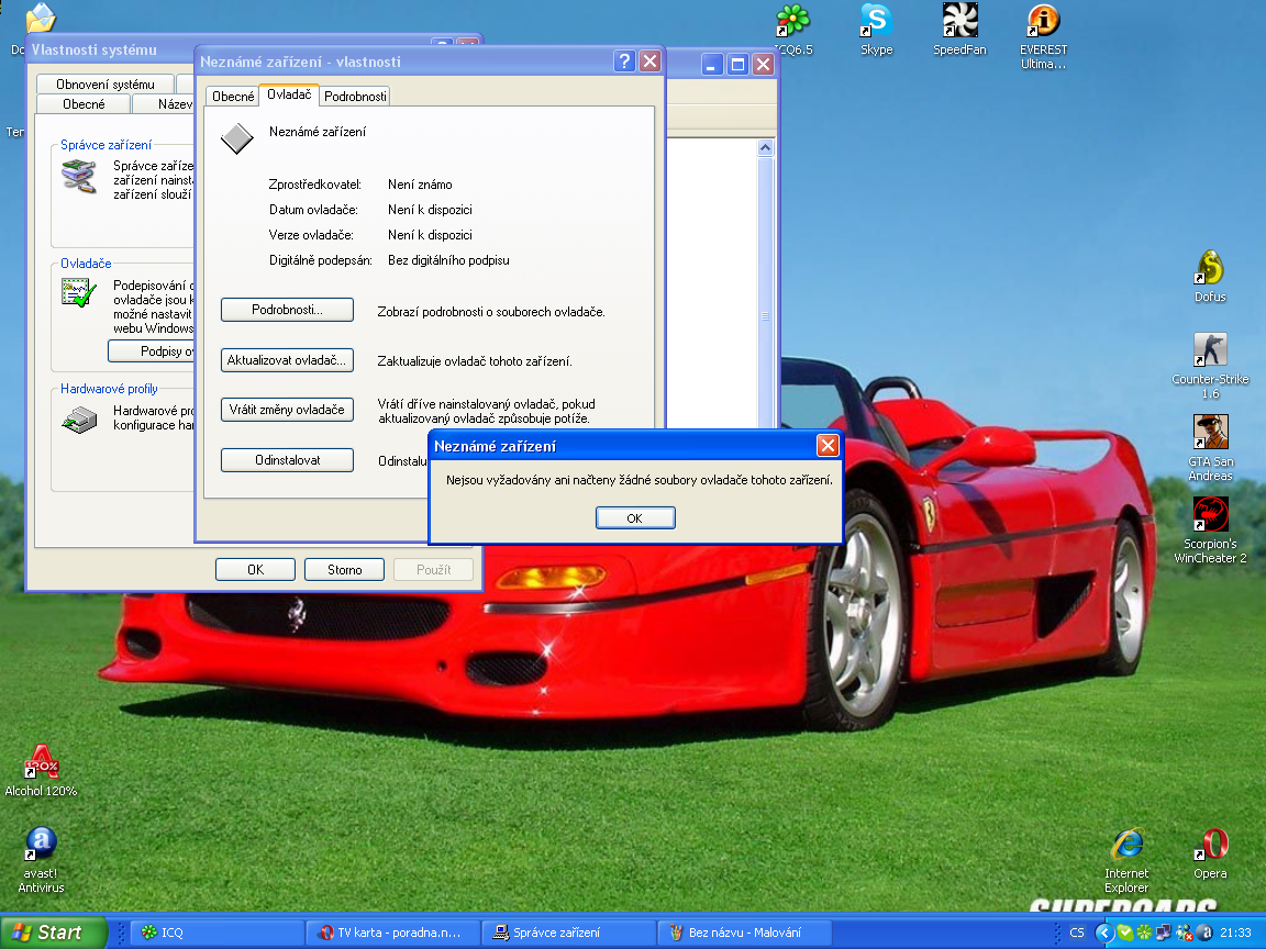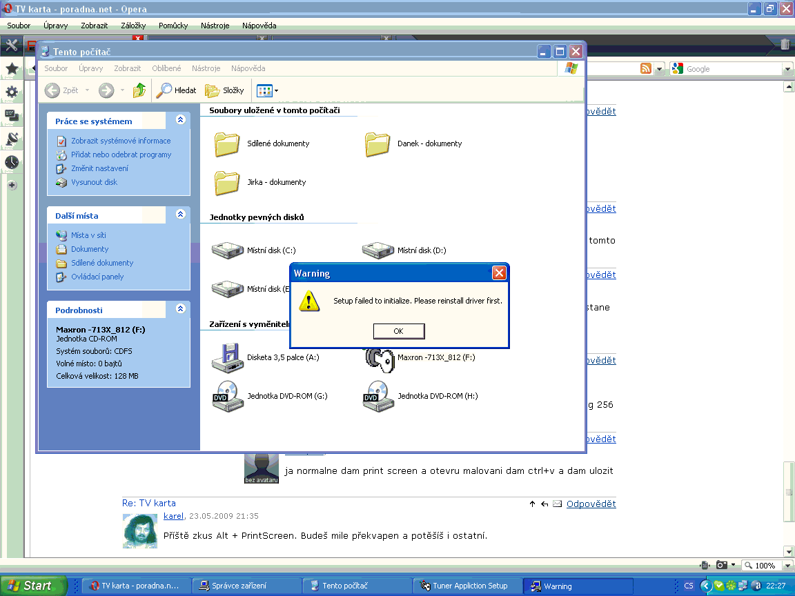 zapojil sem do PC TV kartu nainstaloval ovladac a zůstalo vi ve správci HW nejake nezname zařízení a nejde k nemu nainstalovat ovladac z CD který byl ke karte a kdyz chci nainstalovat program MAX TV přes který jde TV tak tak mi to napíse neco FAIL REINSTAL DRIVERS nevíte co s tím?? typ karty je Philips Semiconductors SAA7130 TV Card - video capture