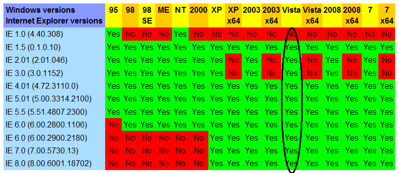 Podľa tabuľky mi vo Vista má fungovať všetko okrem IE 1.0. Po začatí inštalácie mám na výber zo všetkého okrem IE 1.0, 7,0, 8.0. Nezhoduje sa to so žiadnou možnosťou v tabuľke. Najviac sa to ale blíži k Windows 2000. Lenže vo Viste má byť inštalácia povolená aj pre najnovšie verzie IE. Čo mám teraz robiť?