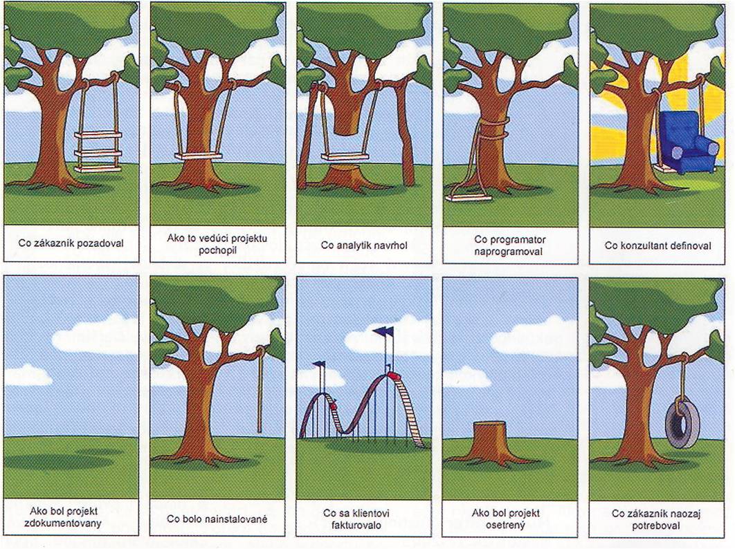 Kdysii byla série obrázků o vývoji SW. Co bylo zadáno, co chtěl zadavatel, jak to pochopil programátor, jak to prezentovalo obchodní oddělení, co dostal zákazník. Bylo to se stromem a houpačkou.