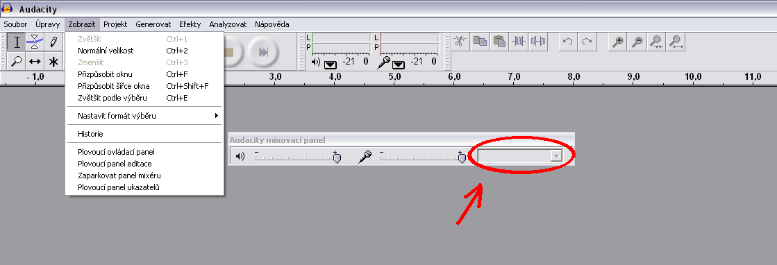 Menu zobrazit/ panely nástrojů/ mixážní panel [1384-audacity-png]