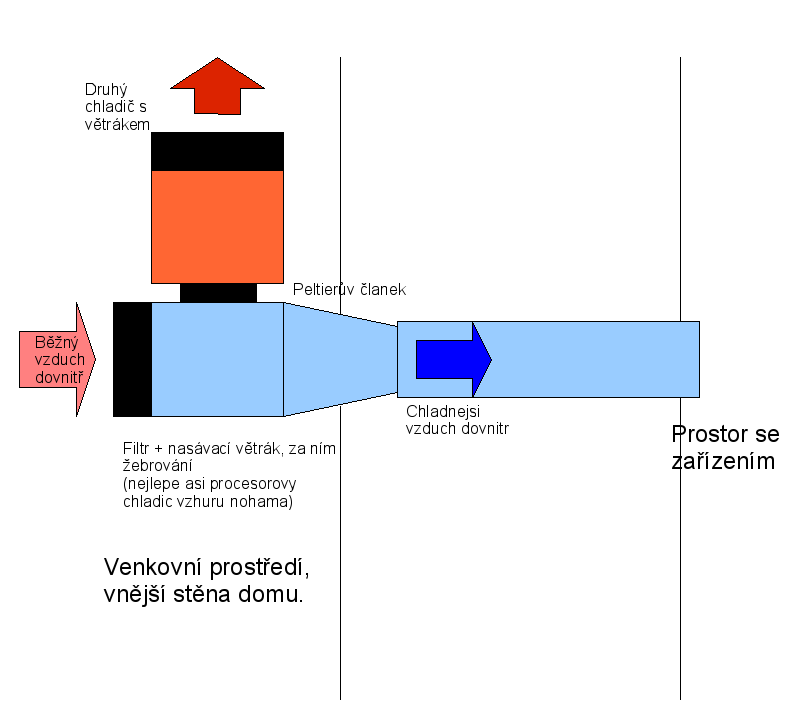 Vzduch nasavany z venku, honeny pres zebrovani, ktere by bylo chlazeno peltierovym clankem. Tim by byl vzduch chladnejsi a pres mikrofilt by byl vhanen do uzavreneho prostoru. Tam by nebyly pocitacove skrine, ale komponenty by byly umisteny na jedne desce bez uzavreni v pocitacove skrini. Na druhem konci by byl vyfuk, ktery by v lete smeroval ven, v zime by pritapel v predsini.