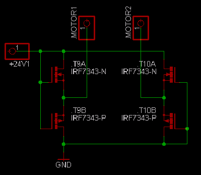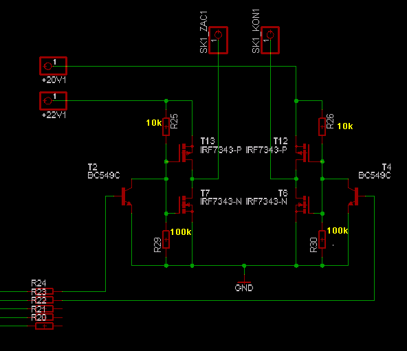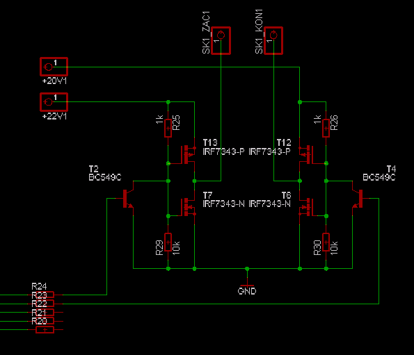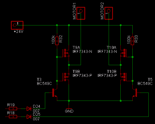 3) Odpory R25 a R26 jsou zbytečně malé, protože FETy jsou buzeny skutečně napěťově. Velikost těchto odporů ovlivňuje pouze, spolu se vstupní a Mullerovou kapacitou, rychlost přechodu z vypnutého stavu do sepnutého a naopak. Protože se však mají spínat, jak jsem vyrozuměl, motory, nebudou nároky na rychlost spínání nijak vysoké.