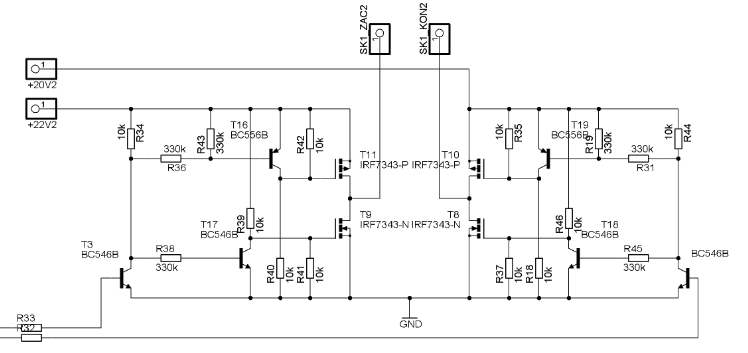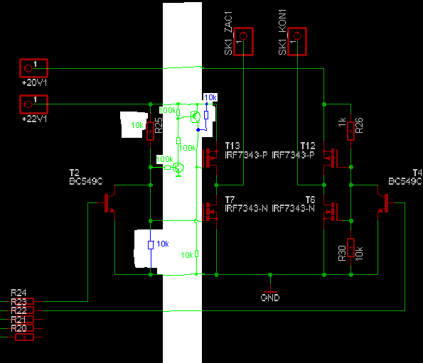 2) Zůstal jsi v půli cesty. Tak, jako jsi zvýšil budící napětí pro kladnou větev (doporučoval bych napětí alespoň o 4V vyšší, než to výkonově, tedy ne 22V, ale 24V, raději však více), tak musíš snížit budící napětí pro dolní větev až do záporných hodnot. Je tedy třeba emitory budících tranzistorů T2 a T4 posadit na záporné napětí velikosti -4V a více (třebas i -10V). Vyplynou z toho změny v buzení těchto tranzistorů, protože ovládací signály jsou vůči GND a ne vůči tomu zápornému napětí. Potřebný převodník je ale jednoduchý - vyřeší to jeden tranzistor PNP a jeden odpor.